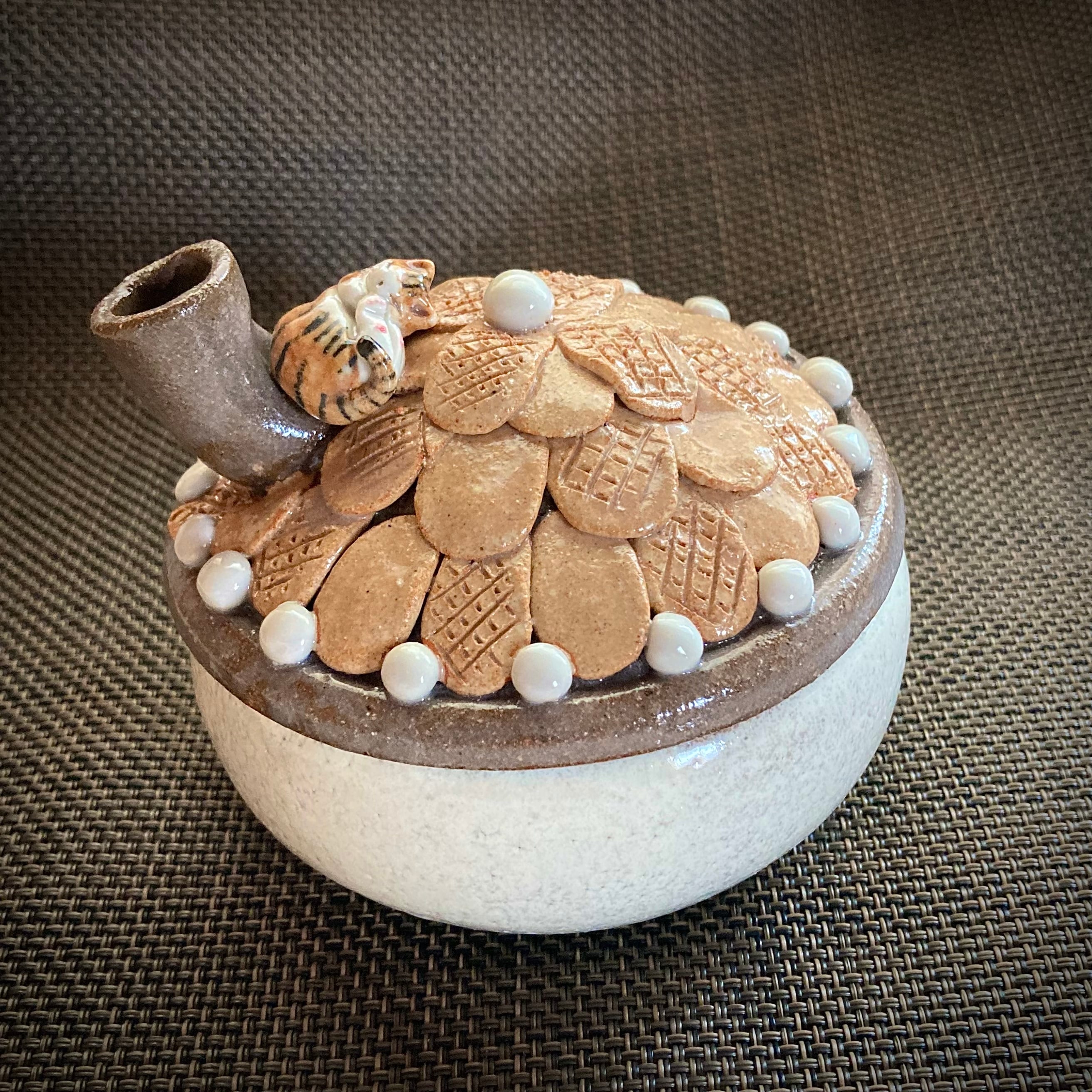 *陶芸用粘土をろくろで成形し、白い化粧土をかけて焼いております。お漬物やお茶うけのお菓子などを入れるのはもちろん、小物入れやインテリアの一つとしてもお使いになれます。